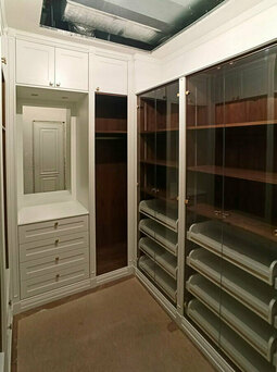 Встраиваем в гардеробные любые системы хранения: корзины, выдвижные держатели, полки для обуви и т.п. Оснащаем гардеробные выдвижными и сдвижными зеркалами.
