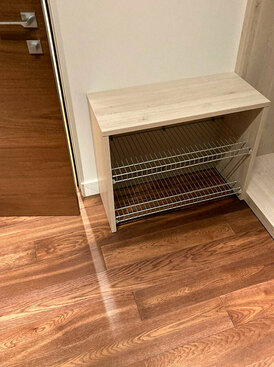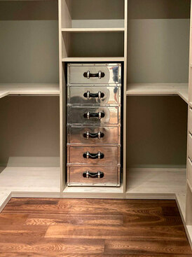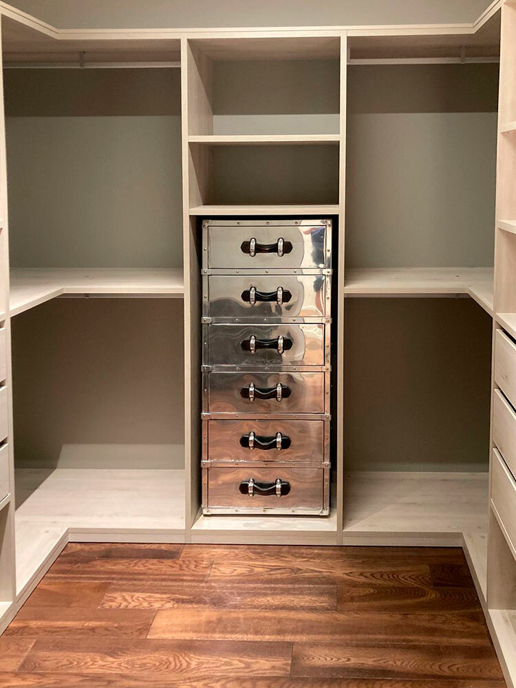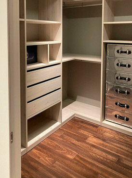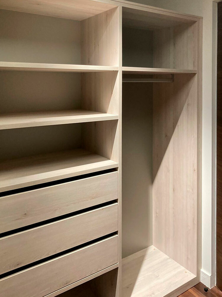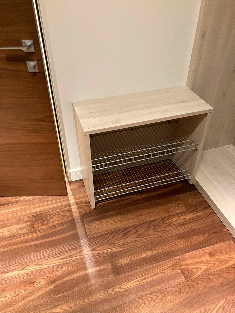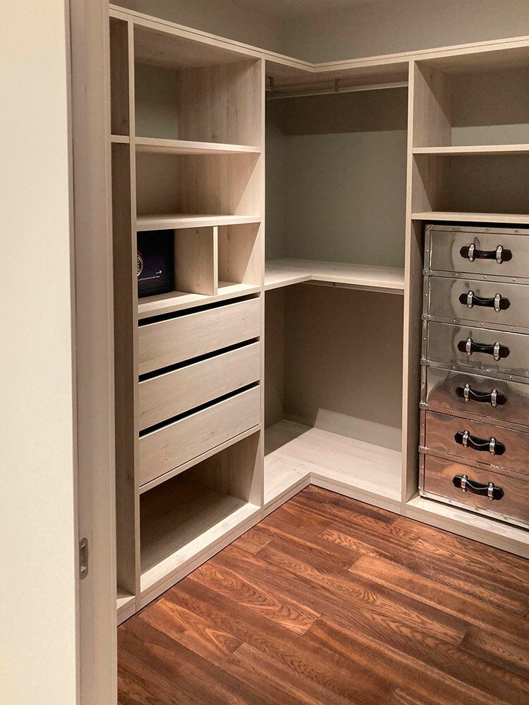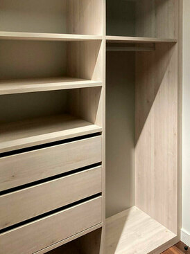 П-образная гардеробная выполнена из ЛДСП в 2 цветах: для корпусов мы использовали светлое дерево, а для задних стенок монотонный светло-серый цвет. Углы сделаны максимально доступными и оснащены штангами для одежды. Нашлось место и для небольшой тумбочки для обуви.