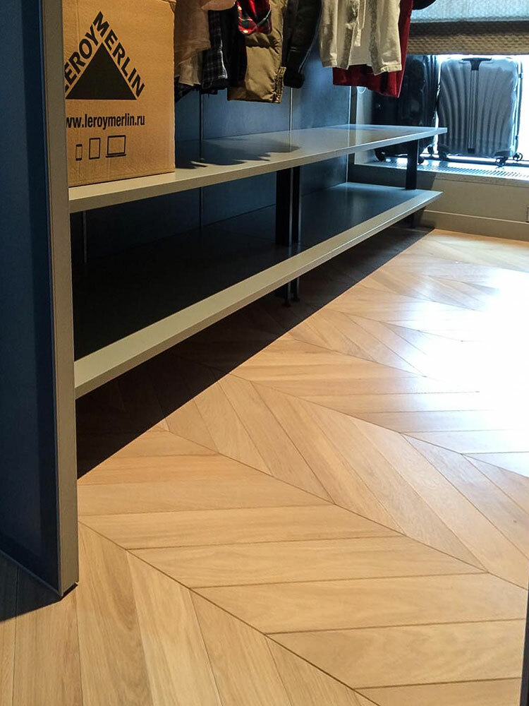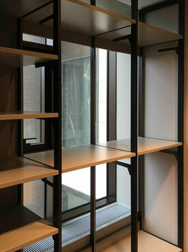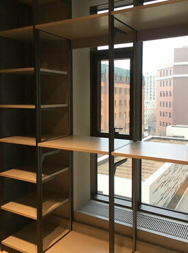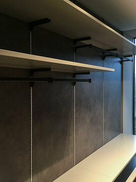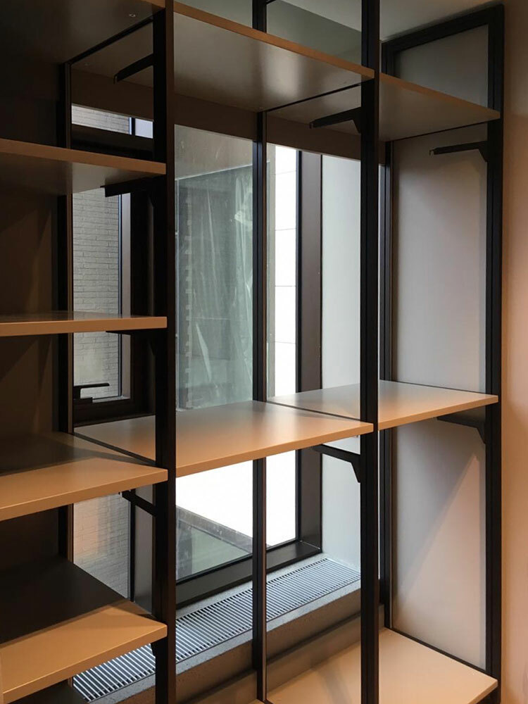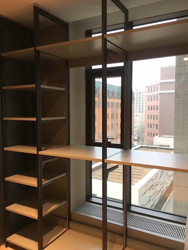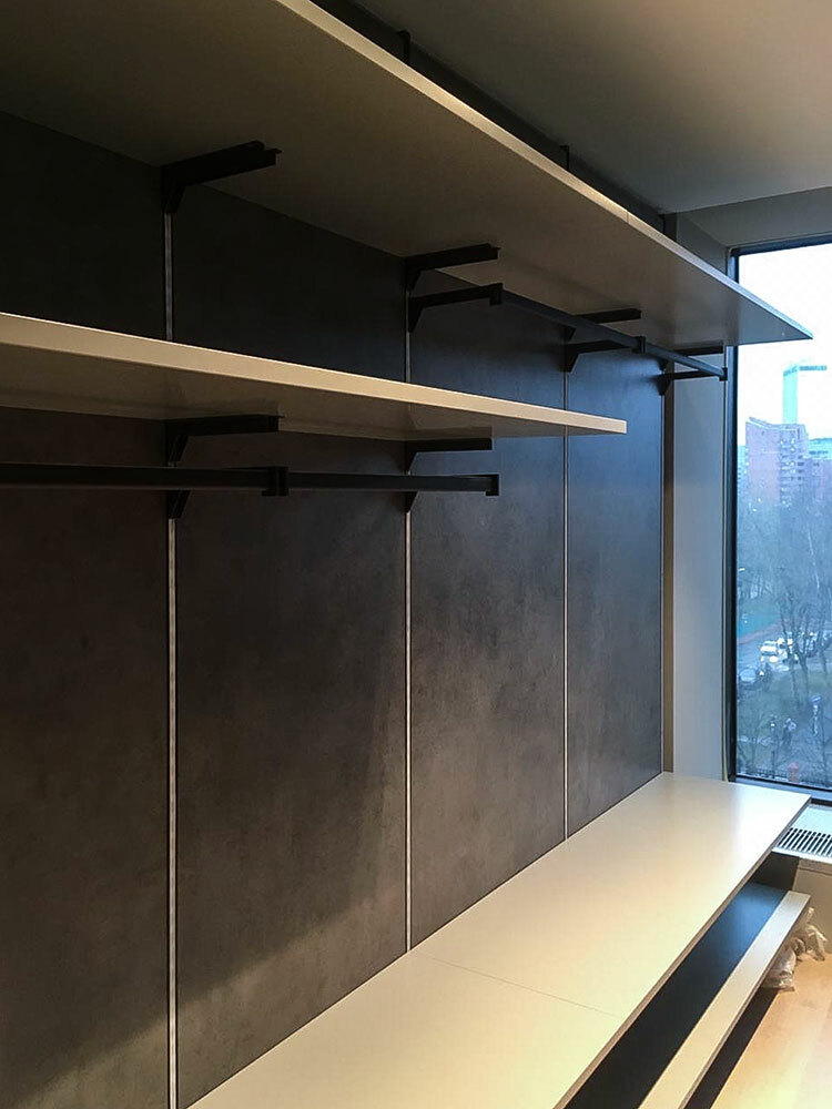 Использование профиля для опорных стоек в гардеробной позволило разместить перед окном стеллаж со штангами для одежды. На противоположной стене установлены длинные полки и штанги.