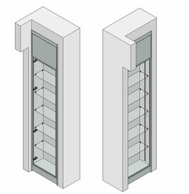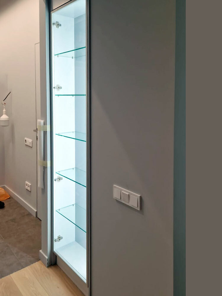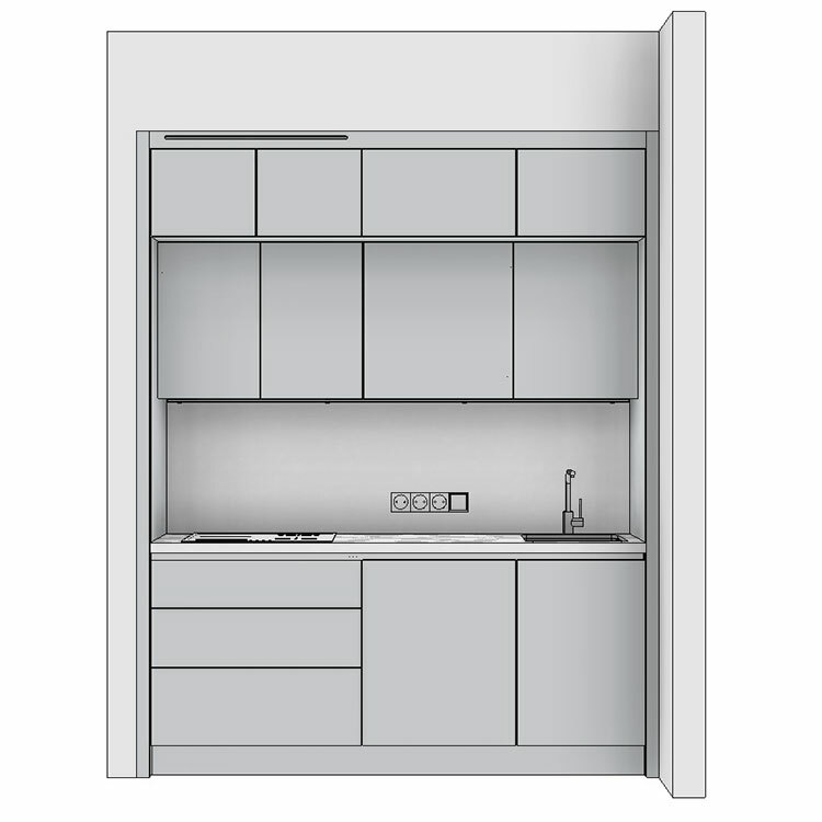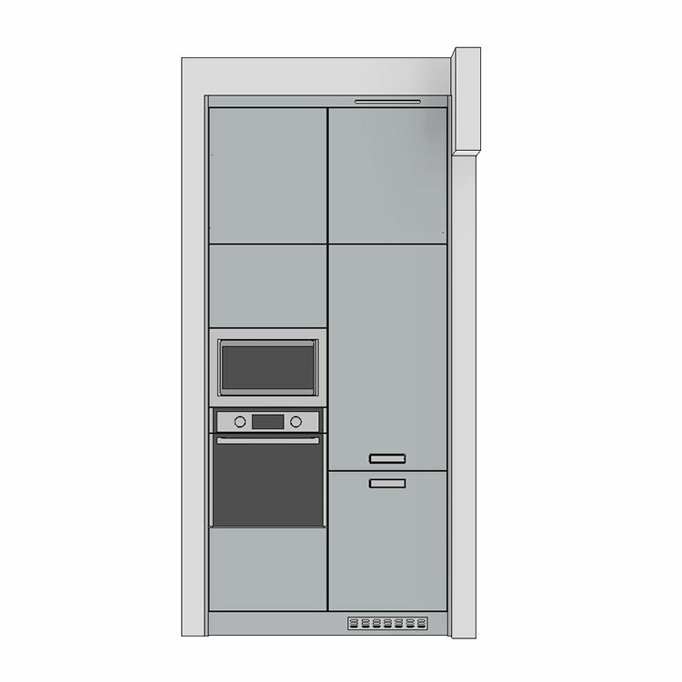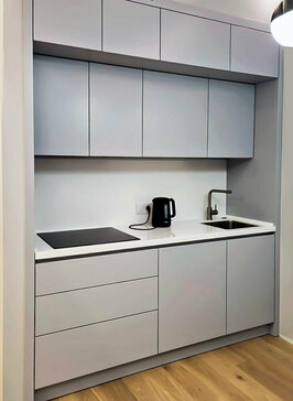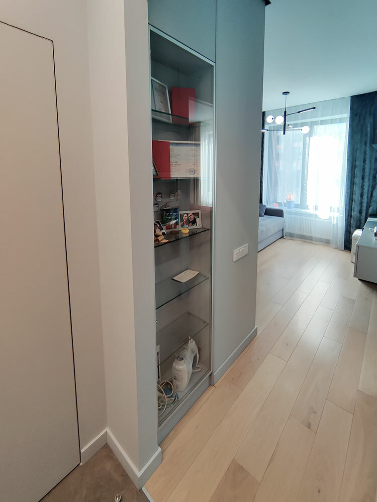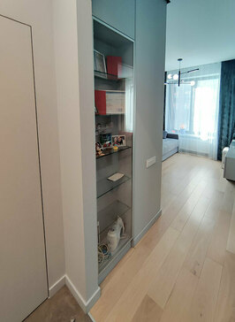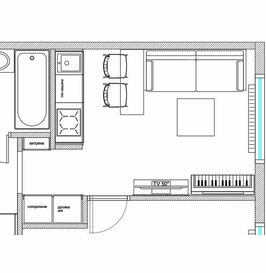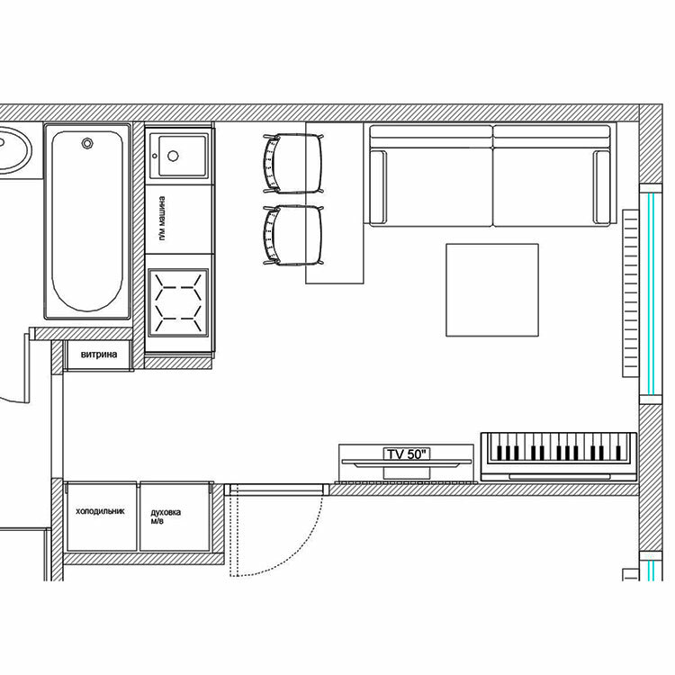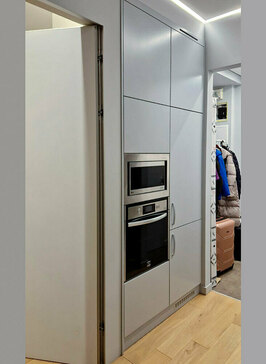 Все 3 части этой кухни: зона приготовления, шкафы с встроенной техникой и витрина были встроены в ниши. В результате кухня "слилась" со стенами и освободилось место для полноценной гостиной с диваном, телевизором и пианино.