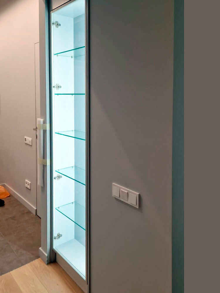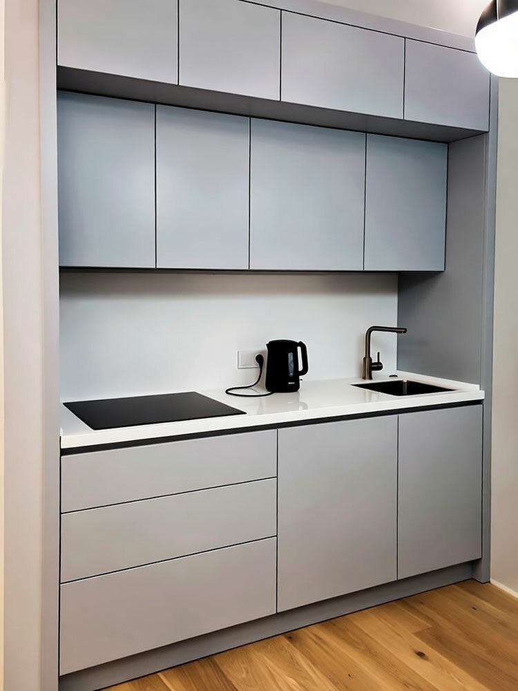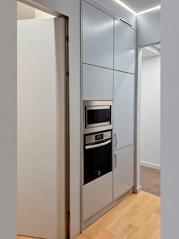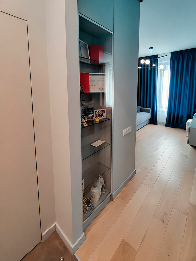 Кухня разделена на 3 зоны: зона мойки и приготовления, зона хранения и витрина. Каждая зона встроена в отдельную нишу. Фасады выкрашены в цвет, близкий к цвету стен. Как результат - кухни в гостиной как будто нет вовсе, свободно расположились диван, телевизор и пианино.