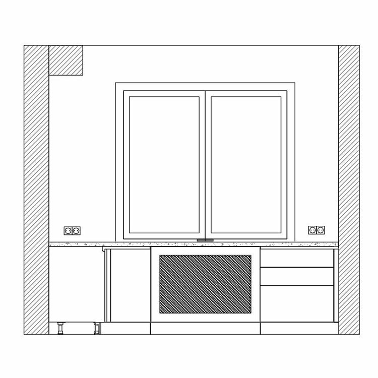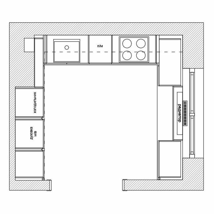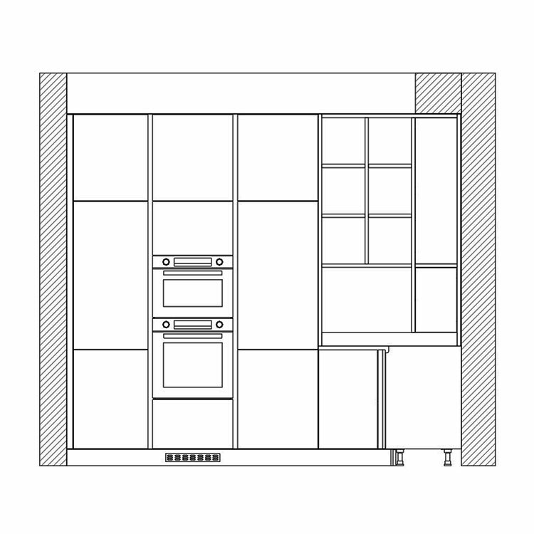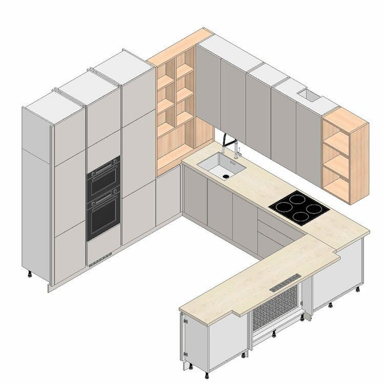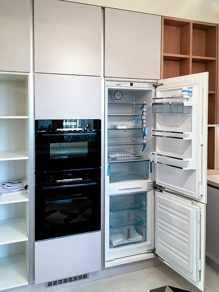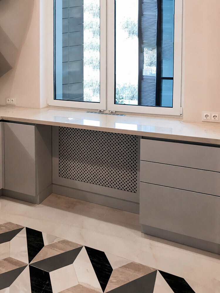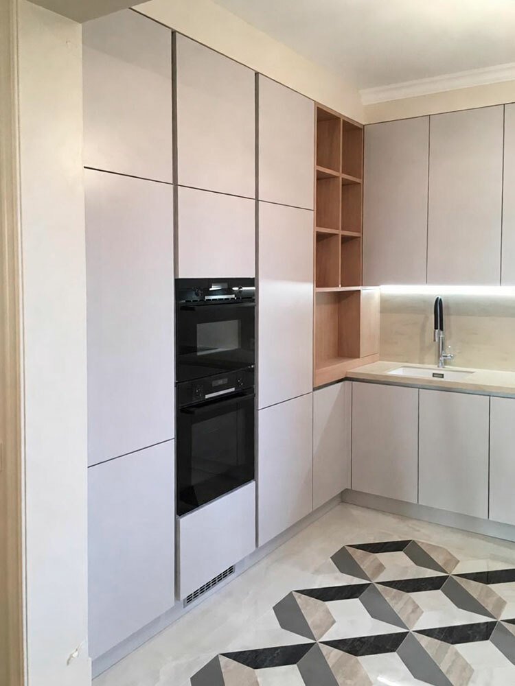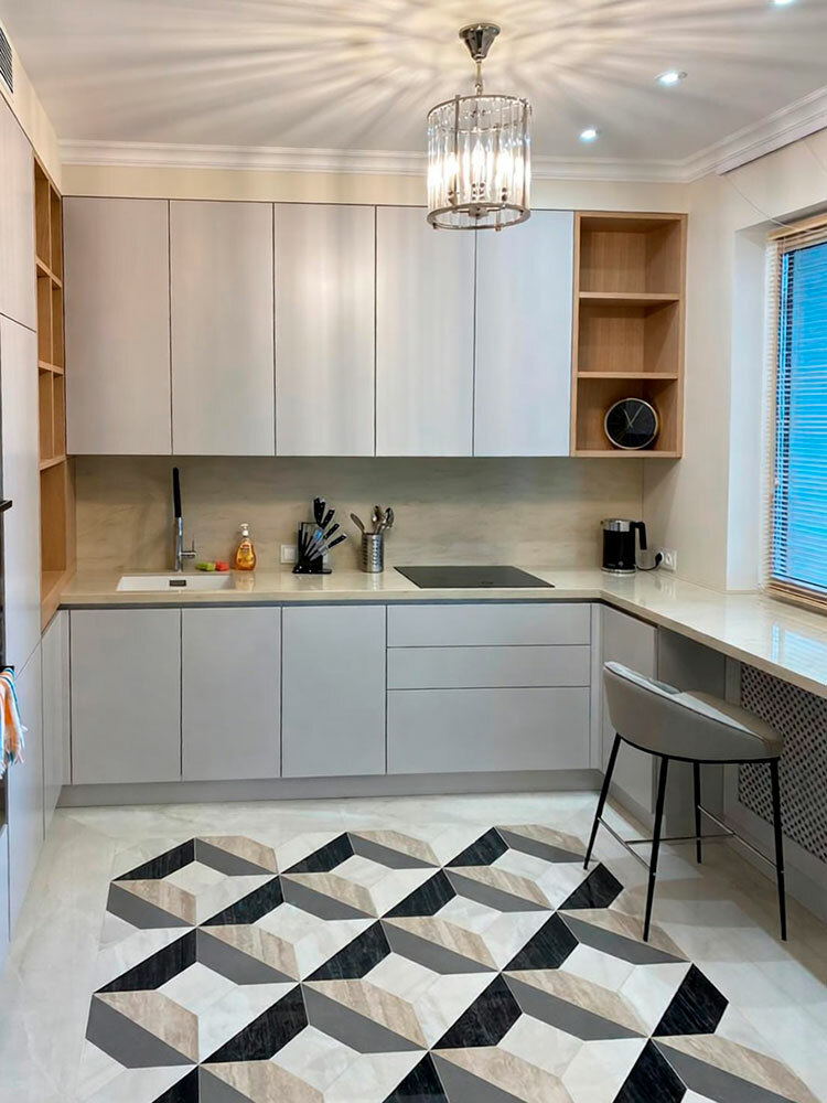 П образная кухня спланирована так, чтобы объединить столешницу с подоконником и устроить напротив окна небольшой столик для завтрака. Высокие шкафы со встроенной техникой разместились вдоль стены. Стеллажи в шпоне, расположенные по углам, добавляют кухне уюта.