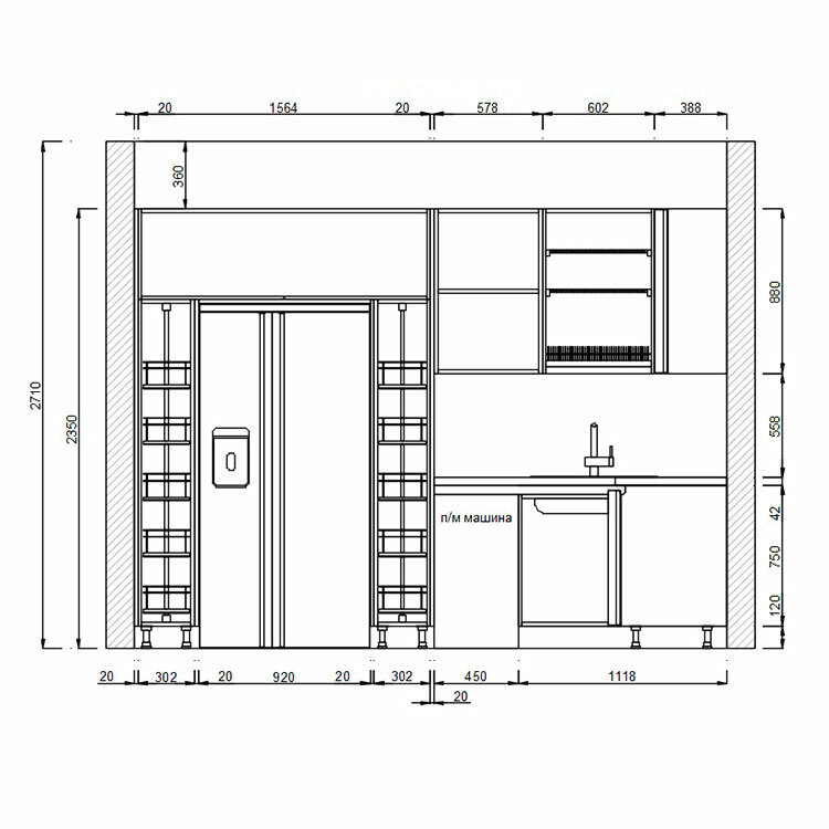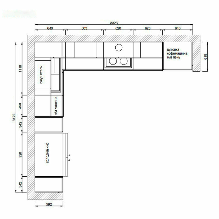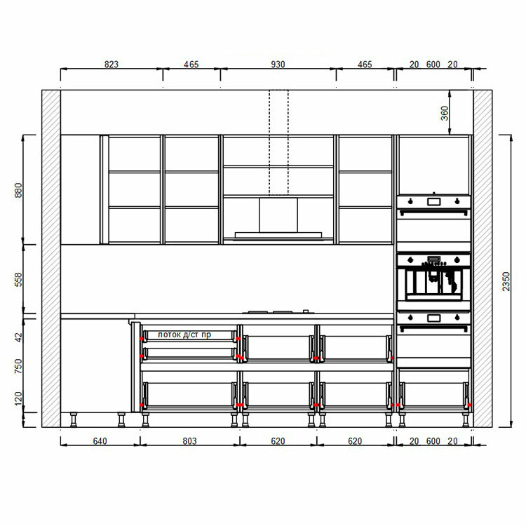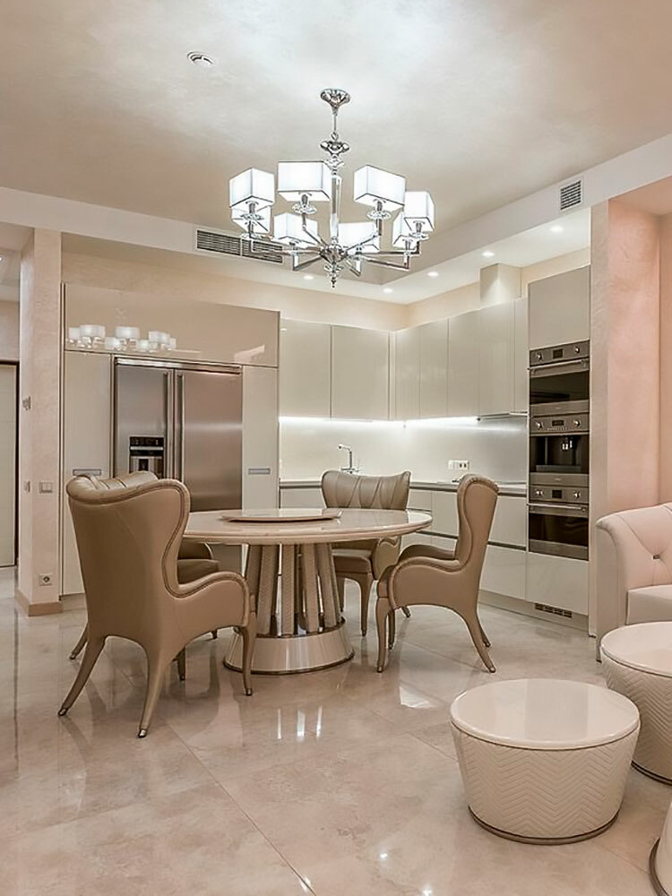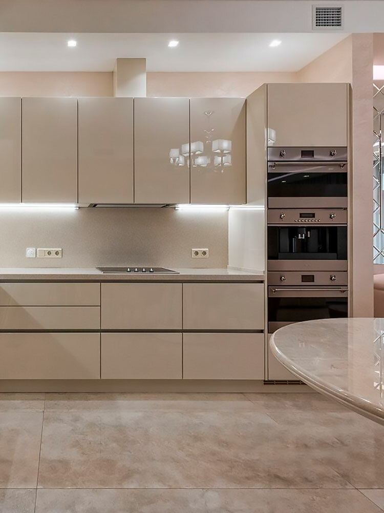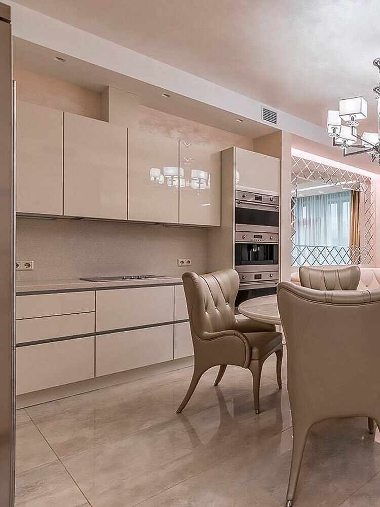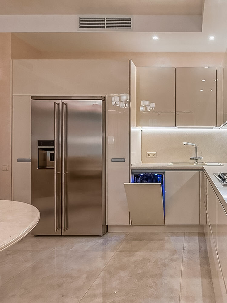 Угловая кухня расположена в красиво отделанной гостиной с мраморным полом. Для фасадов была выбрана глянцевая отделка. С одной стороны кухни шкафы для хранения обрамляют большой холодильник Side by side, с другой стороны разместилась колонка с печами и кофемашиной.