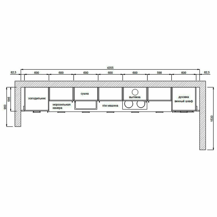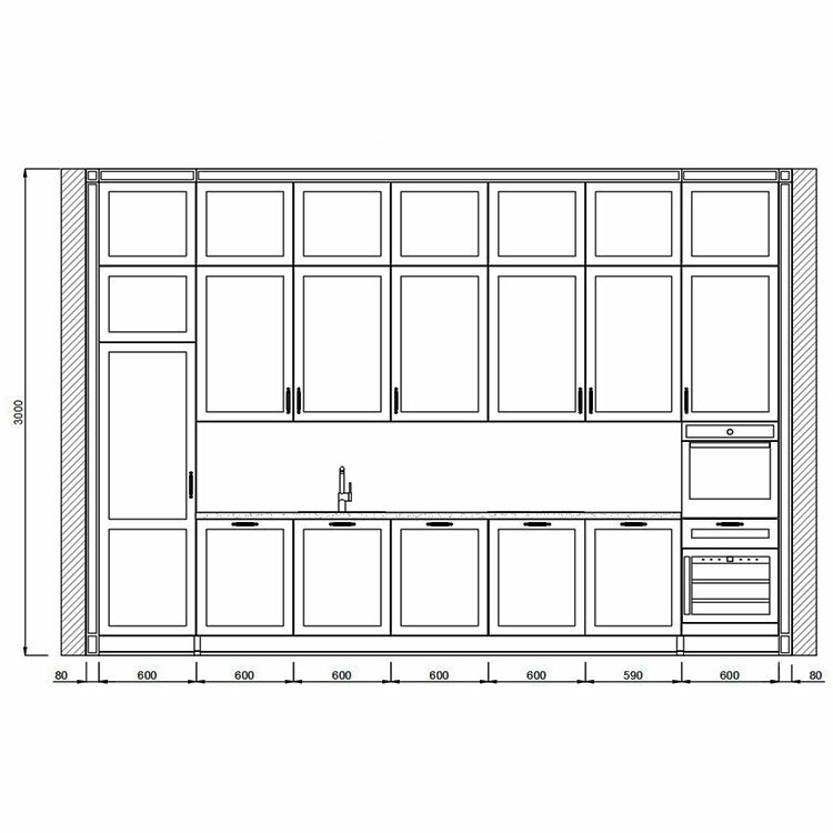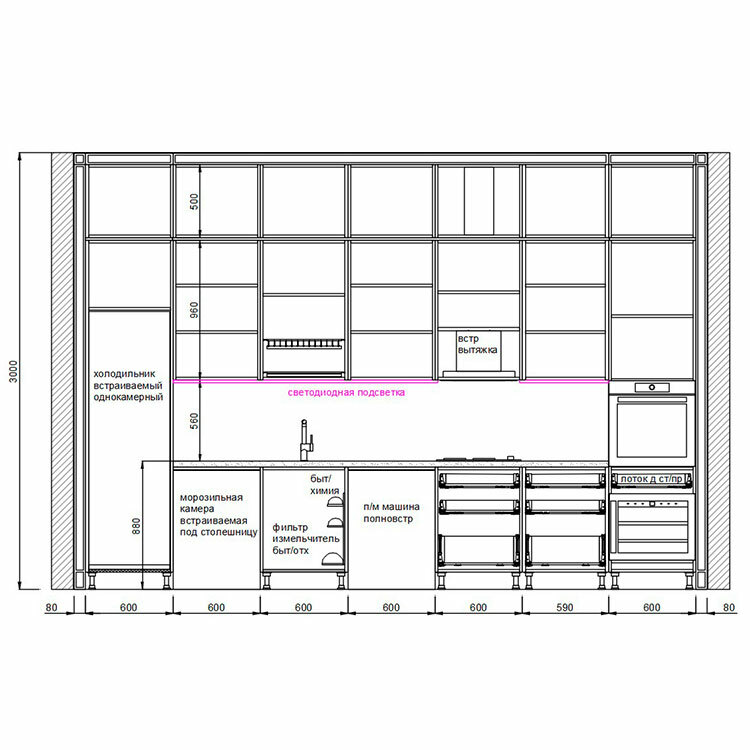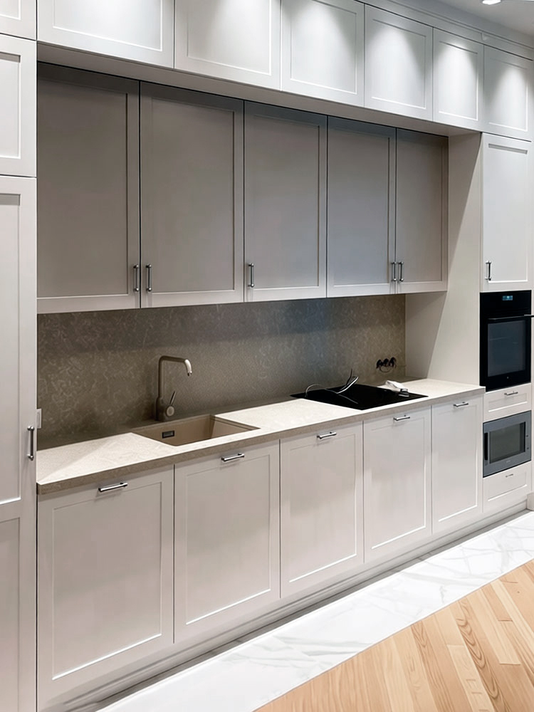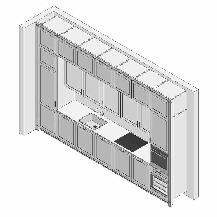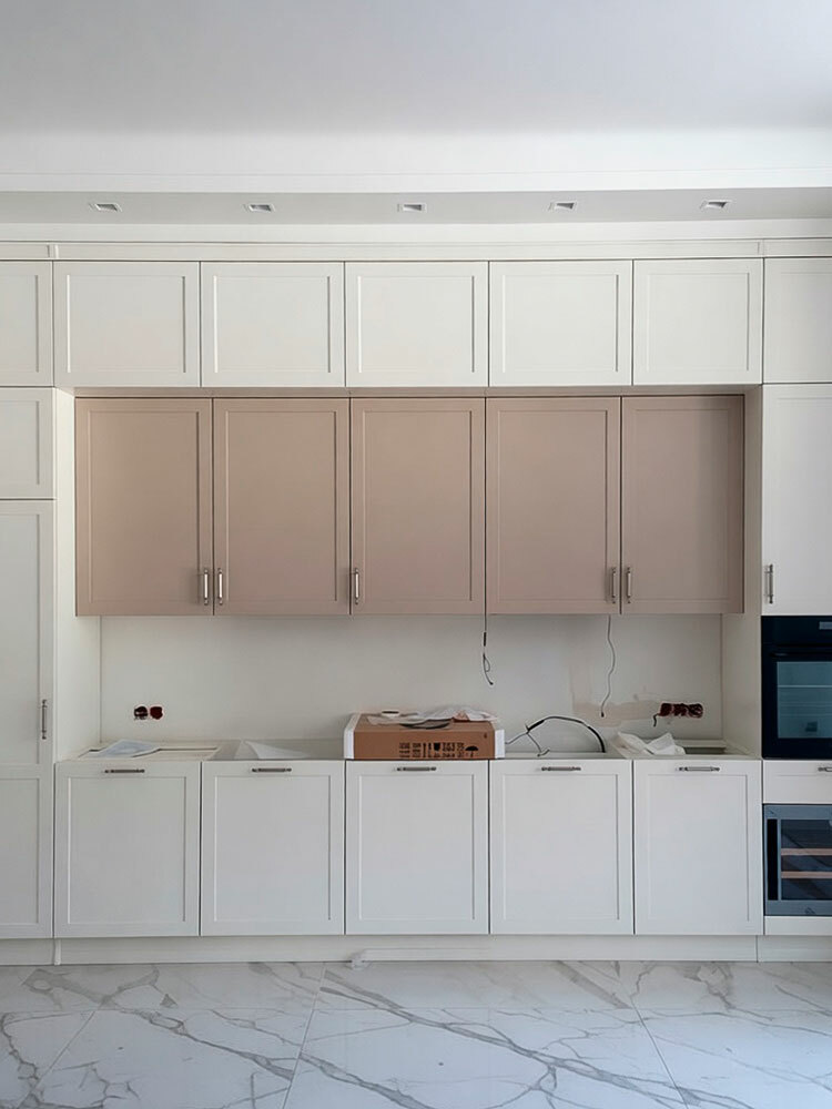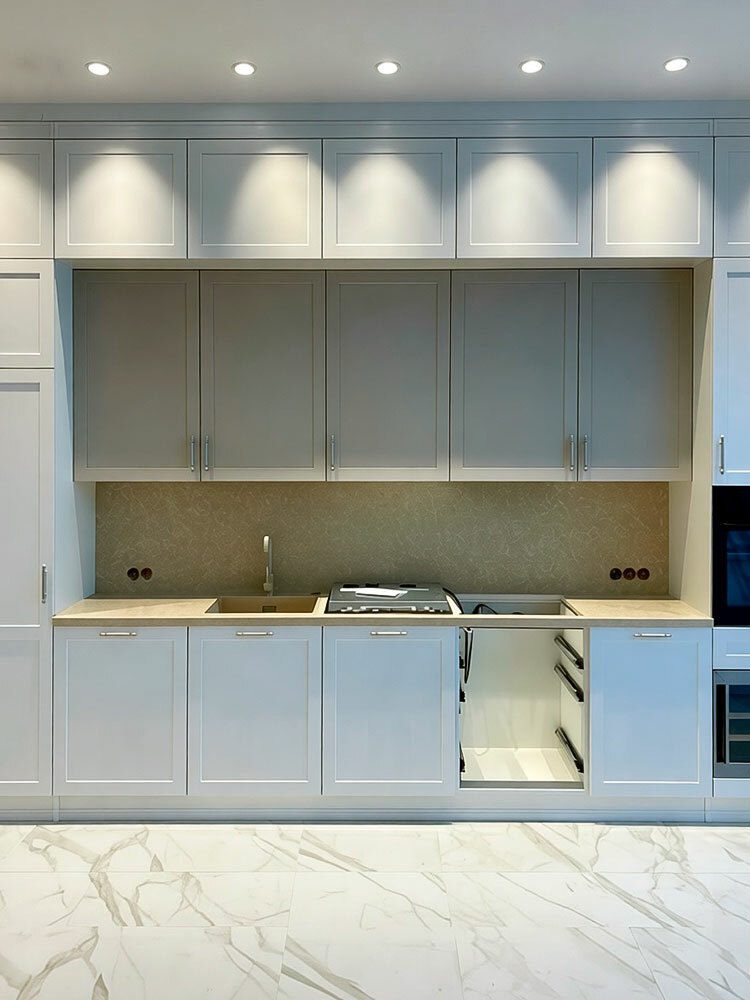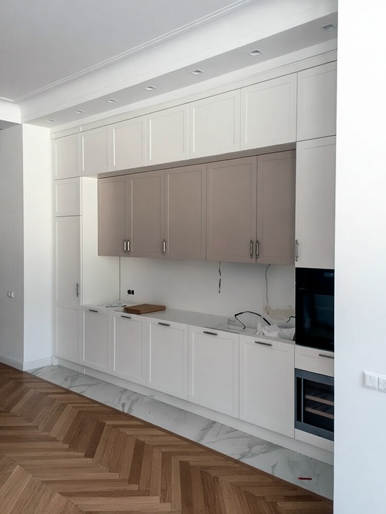 Кухня с антресолями красиво вписалась в длинную нишу высотой 3 метра. Кухня сделана в стиле лёгкой неоклассики - фасады с прямыми рамками, декоративные элементы использованы по минимуму. Встроенная кухня без зазоров выглядит как неотъемлемая архитектурная деталь помещения.