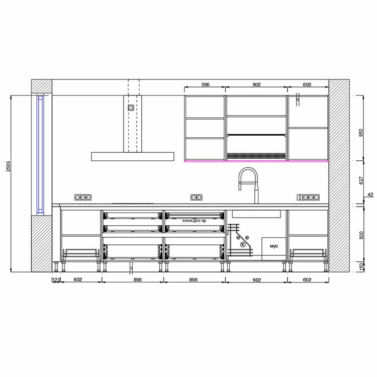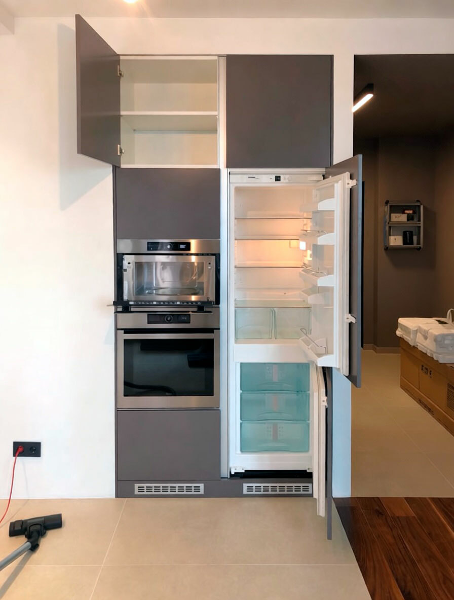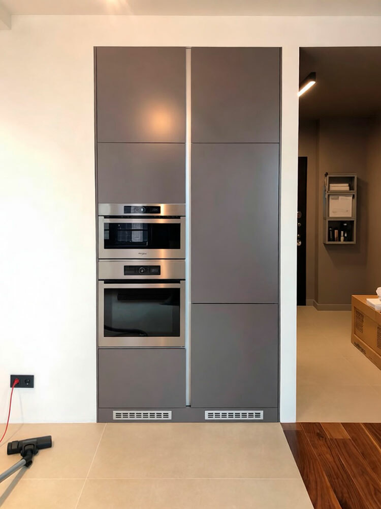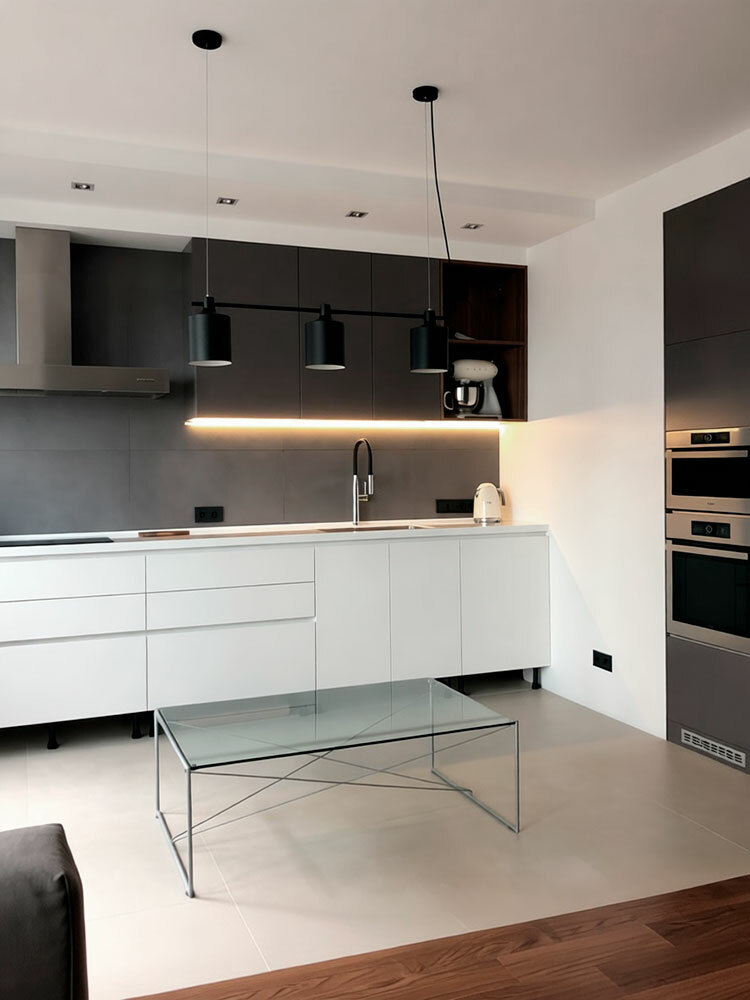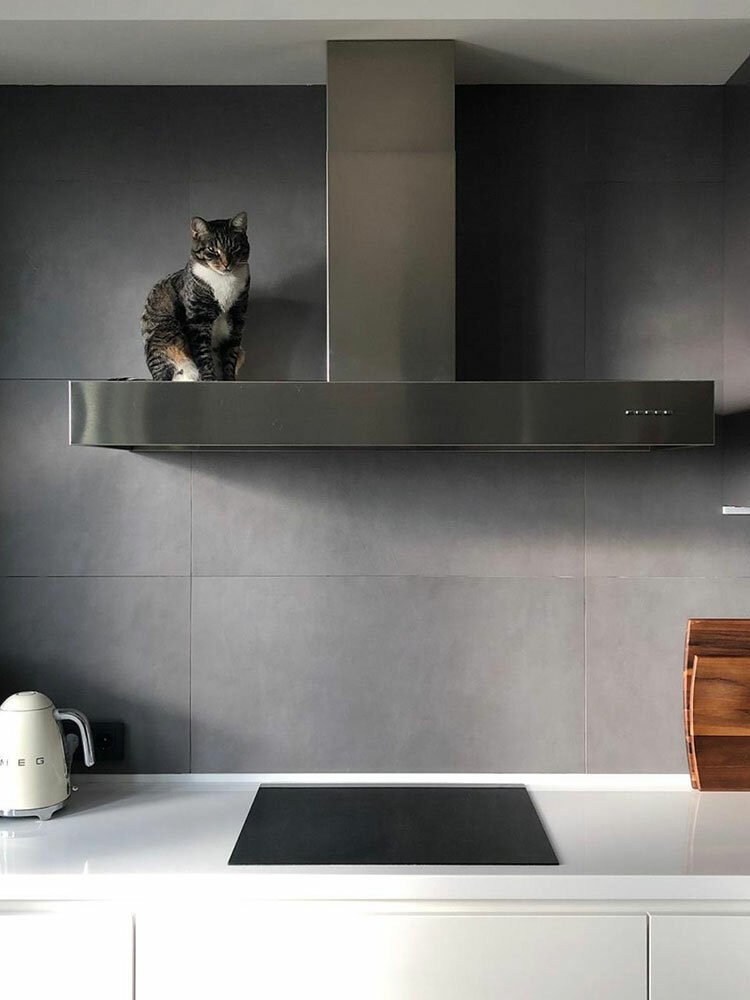 Кухня олицетворяет собой всё, за что нам так нравится минимализм - прямые линии, строгие формы, нейтральные цвета. Длинная столешница позволяет с комфортом заниматься готовкой. Печи и холодильник встроены в отдельный шкаф в нише. Кот хозяина позировал с удовольствием:)